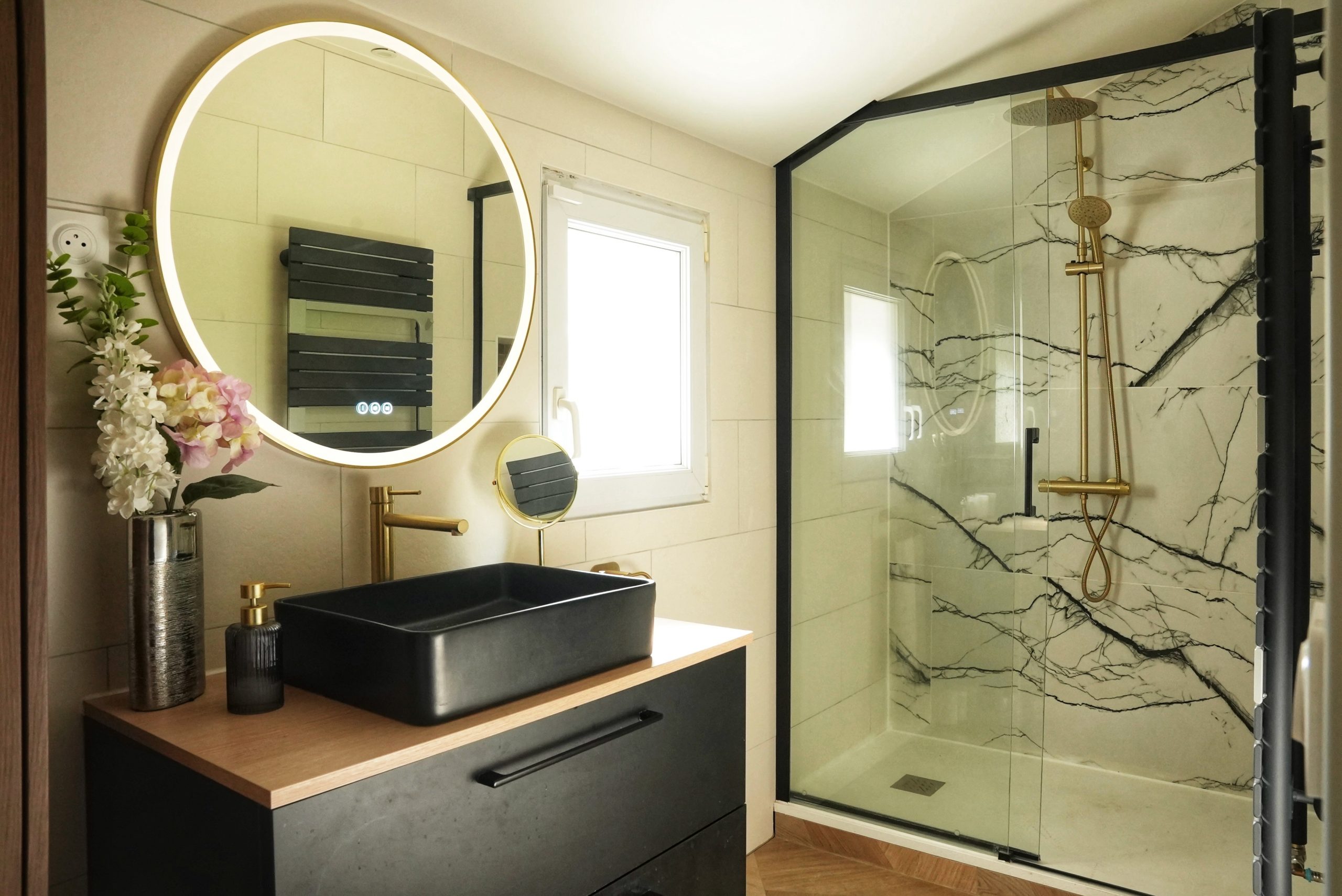 Le noir mat, utilisé pour la vasque, la robinetterie et les menuiseries, s’oppose subtilement au bois clair du plan de travail et aux tons neutres des murs. La douche à l’italienne, habillée d’un carrelage effet marbre aux veines noires, offre une touche luxueuse, sublimée par la robinetterie dorée, créant ainsi une atmosphère à la fois moderne et sophistiquée.
